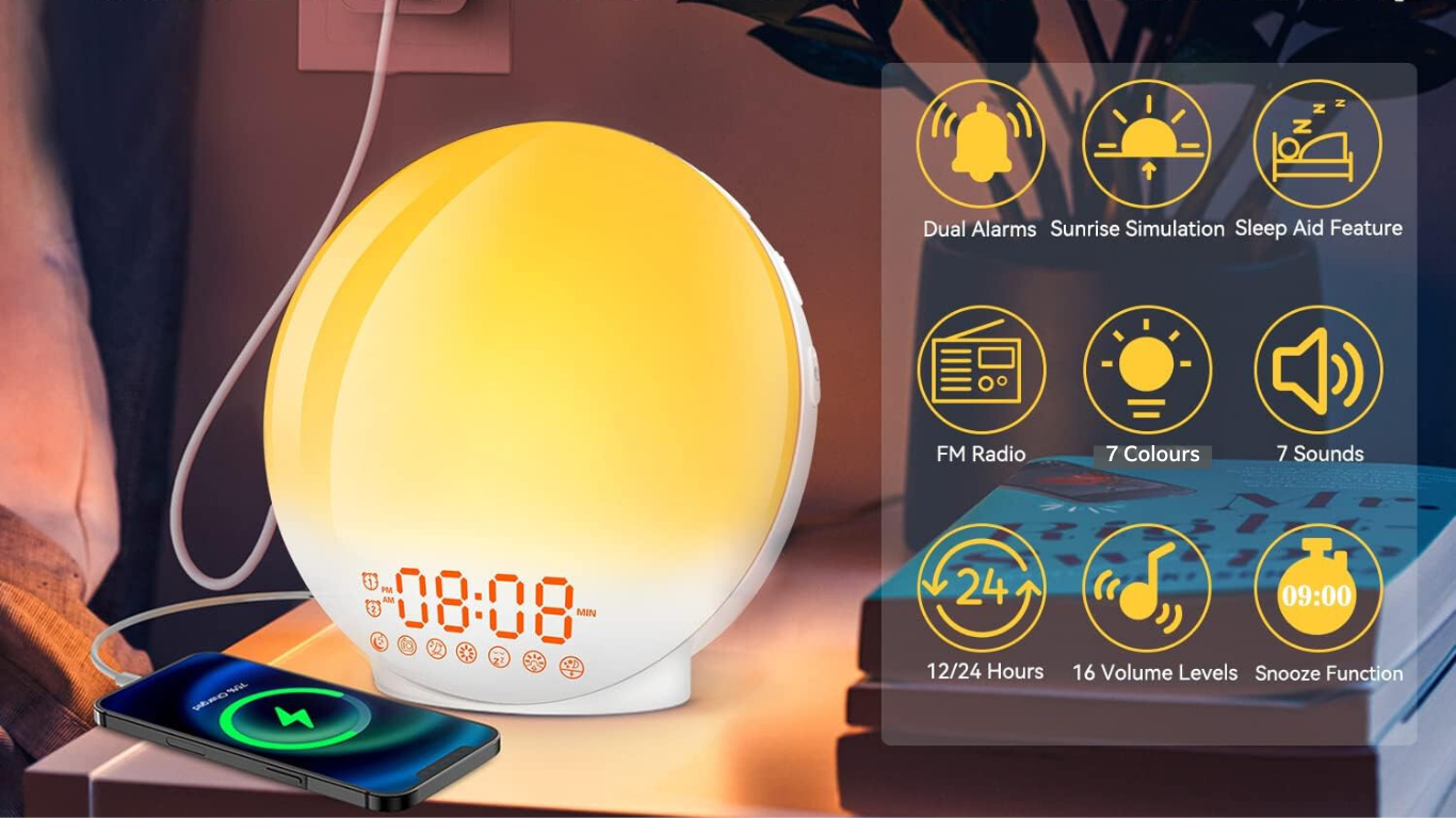 This intelligent clock mimics a natural sunrise by gradually getting brighter before sounding a 'nature' alarm, at your chosen time, to gently ease you out of your slumber. The sunset feature, with its soothing sounds, helps you fall asleep faster.